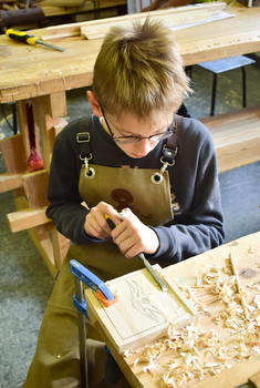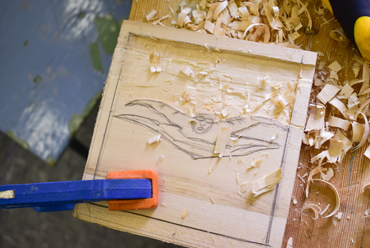 Особенность изделия: крышка украшена плоскорельефной резьбой, изображающей пловца. Этот символ спорта и активного образа жизни подчёркивает способности маленького мастера, его стремление выражать себя через искусство и творчество.